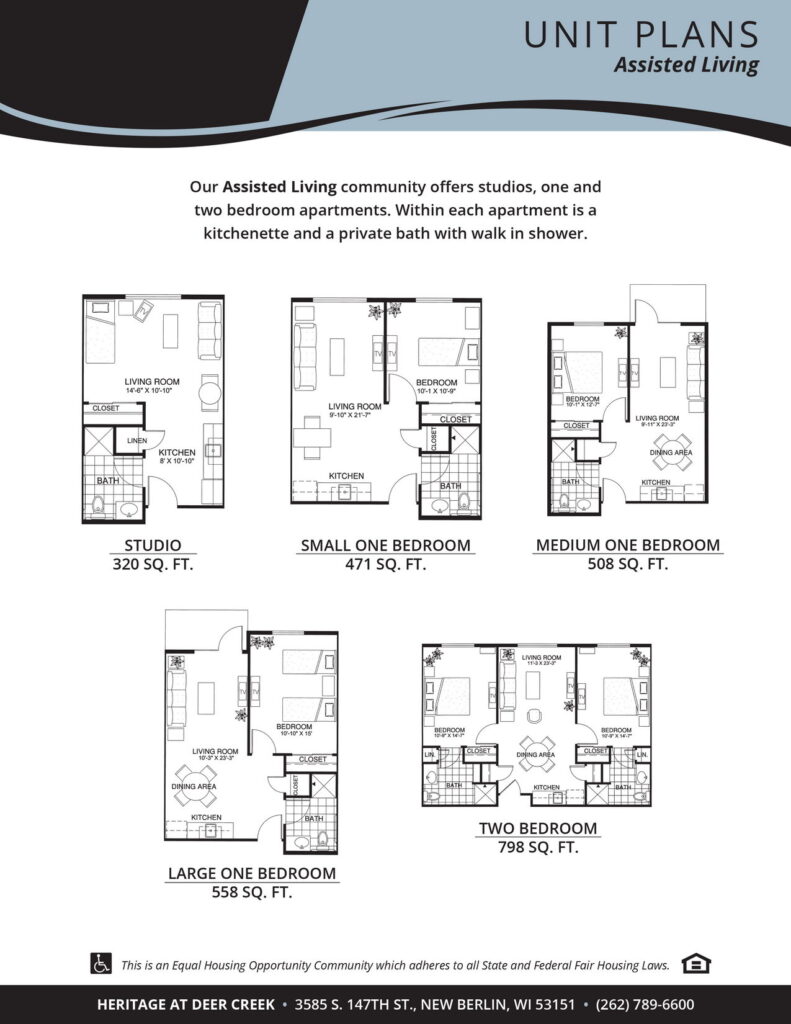 Heritage at Deer Creek apartments pairs a homelike atmosphere and unique amenities with multidisciplinary staff and unparalleled care. We offer a wide variety of apartment layouts for all of your senior care needs. For Assisted Living, we offer 1-bedroom and 2-bedroom layouts that come complete with a kitchenette with modern appliances and high-quality cabinetry, as well as private bathrooms with walk-in showers. Enhanced Assisted Living and Memory Care residents can choose from 3 spacious studio options. Residents are able to choose a furnished space or bring their own furniture. Either way, residents are encouraged to bring personal items and décor to make their space feel like home.